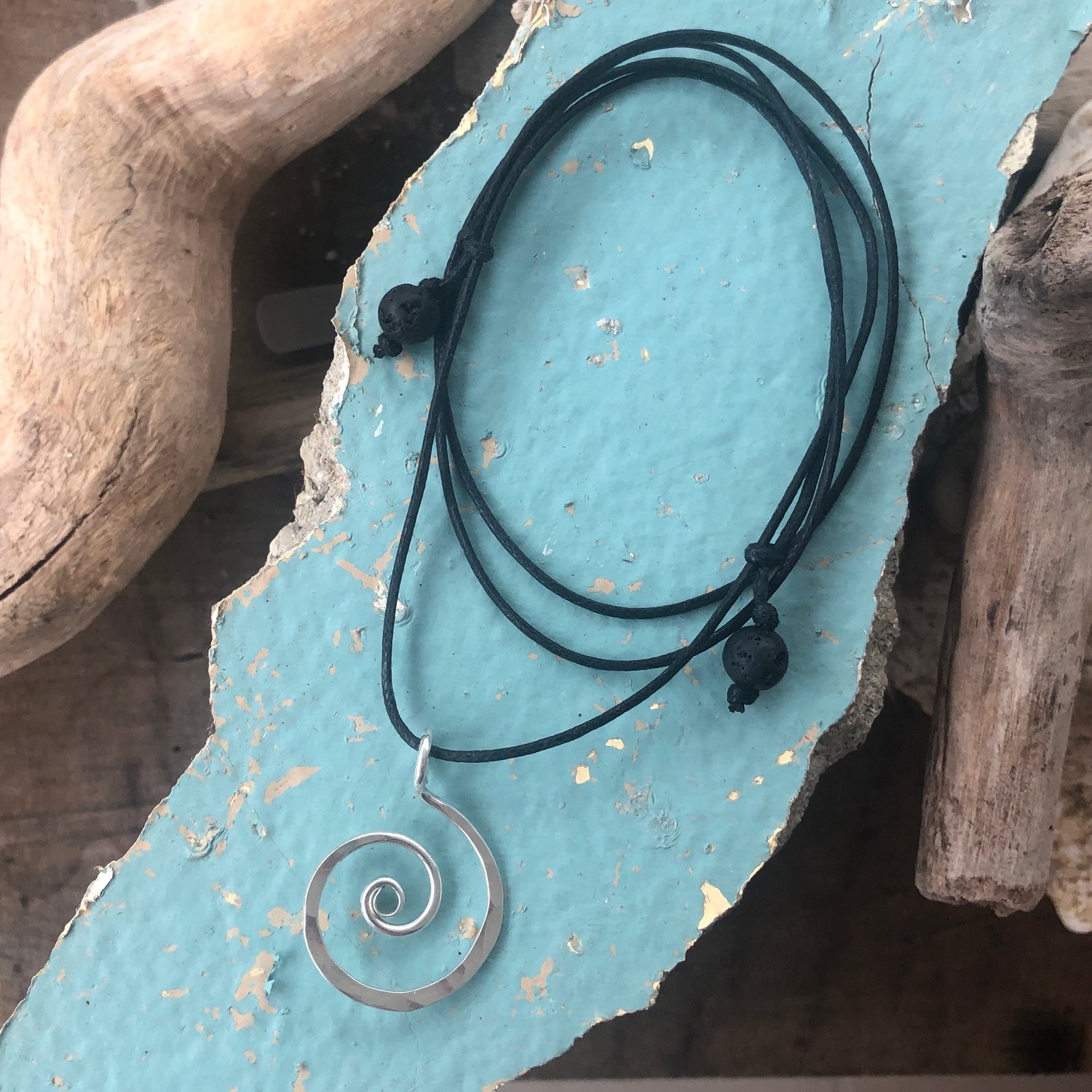 This necklace is a sweet lil spiral (3/4 inch- about the size of a penny) on an adjustable slide-knot woven black linen neck cord. The slider pulls are made with black lava beads. It can be worn low or as a choker. A sweet little accent piece for everyday wear! This itty bitty version of our classic spiral is hand forged with .925 sterling silver. It’s itty bitty and power packed!